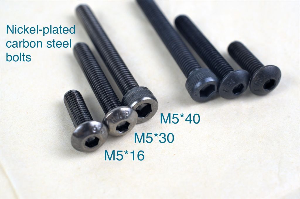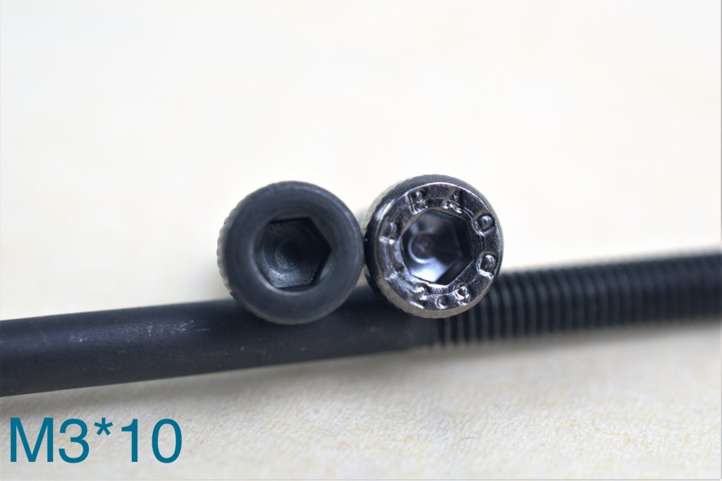 Previously, we’ve tried black oxide and then black zinc-nickel plating in our fastener kits. Black oxide has poor corrosion resistance and many of our users from humid locations reported that these screws rusted very quickly. Black zinc-nickel plating on the other hand has very strong corrosion resistance. However its coating is relatively thick, causing undersizing issues with the hex sockets in our M3 screws.
